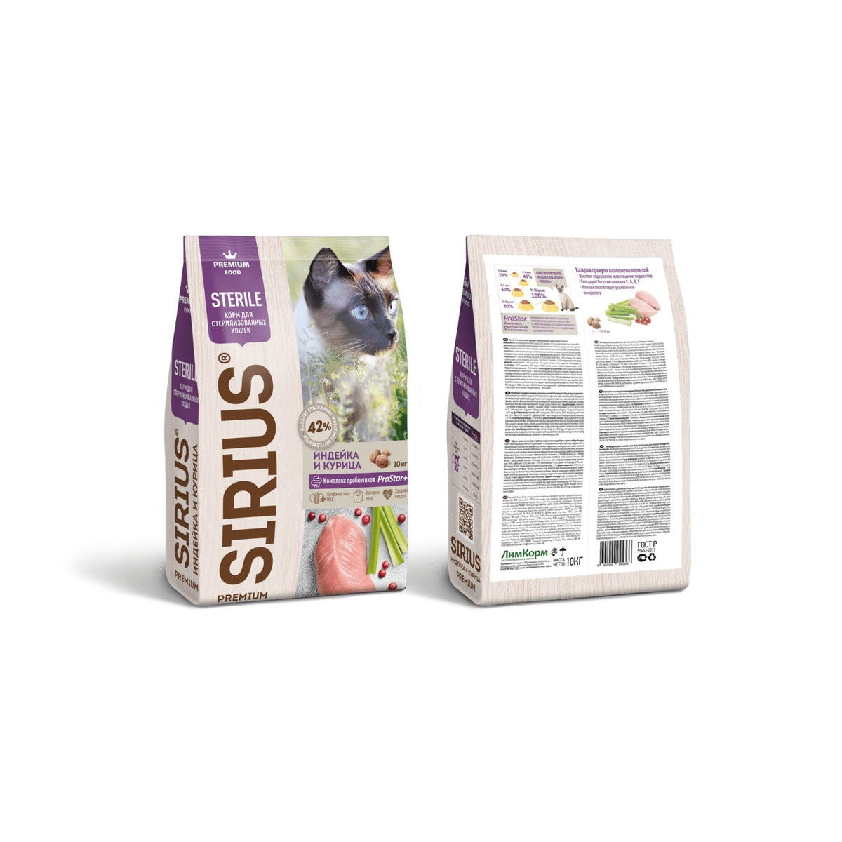 Сухой корм премиум класса SIRIUS для стерилизованных кошек, индейка и курица, 1,5 кг
