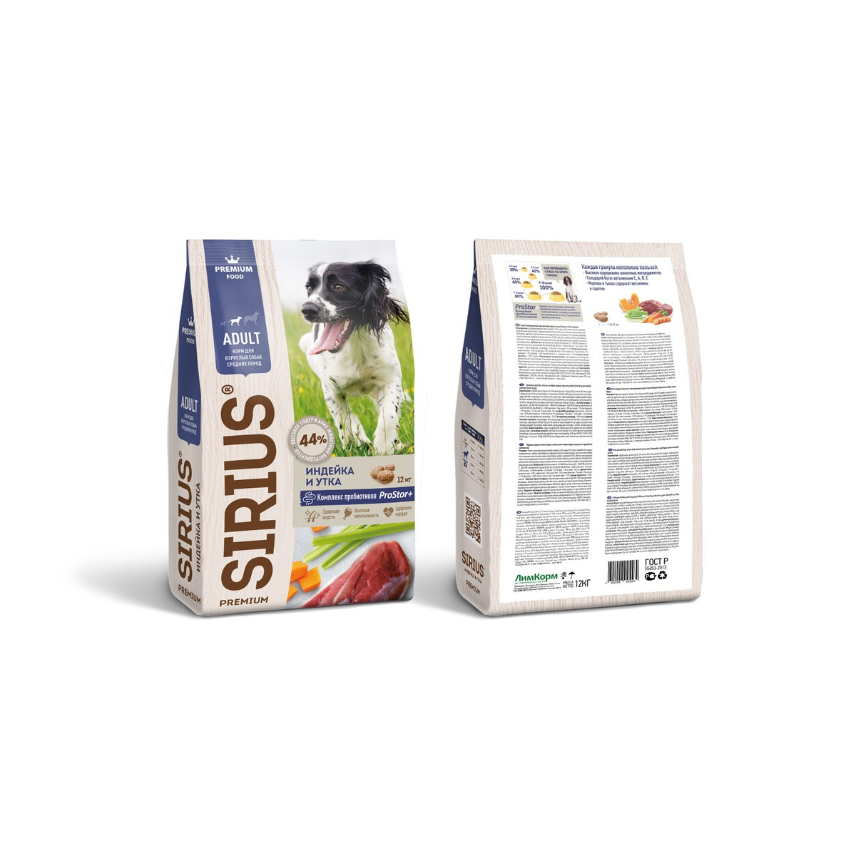 Сухой корм премиум класса SIRIUS для взрослых собак средних пород индейка и утка, 2 кг