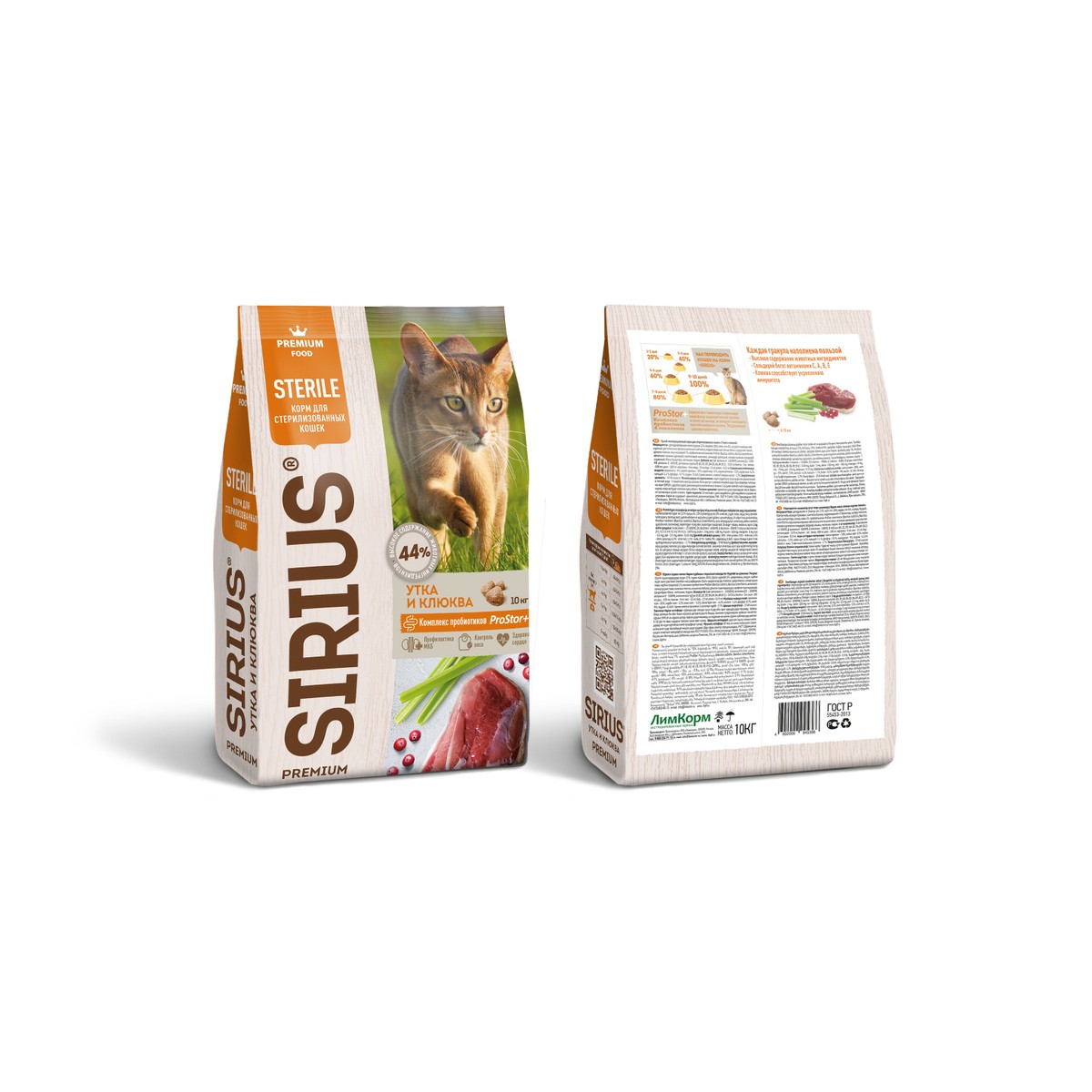 Сухой корм премиум класса SIRIUS для стерилизованных кошек, утка с клюквой, 1,5 кг