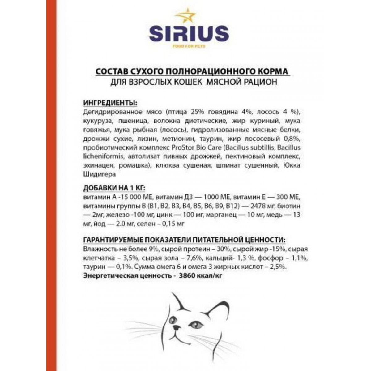 МЯСНОЙ РАЦИОН Сухой корм премиум класса SIRIUS для взрослых кошекИнгредиенты SIRIUS для кошек мясной рацион