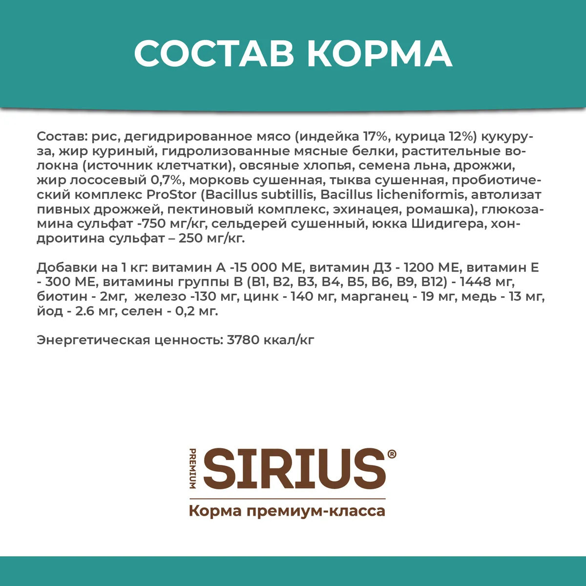 Сухой корм премиум класса SIRIUS для взрослых собак крупных пород индейка с овощами, 2 кг