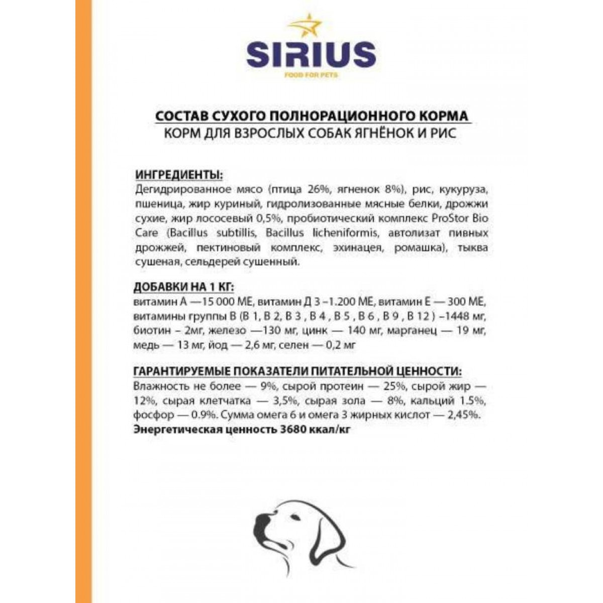 ЯГНЕНОК С РИСОМ Сухой корм премиум класса SIRIUS для взрослых собак
