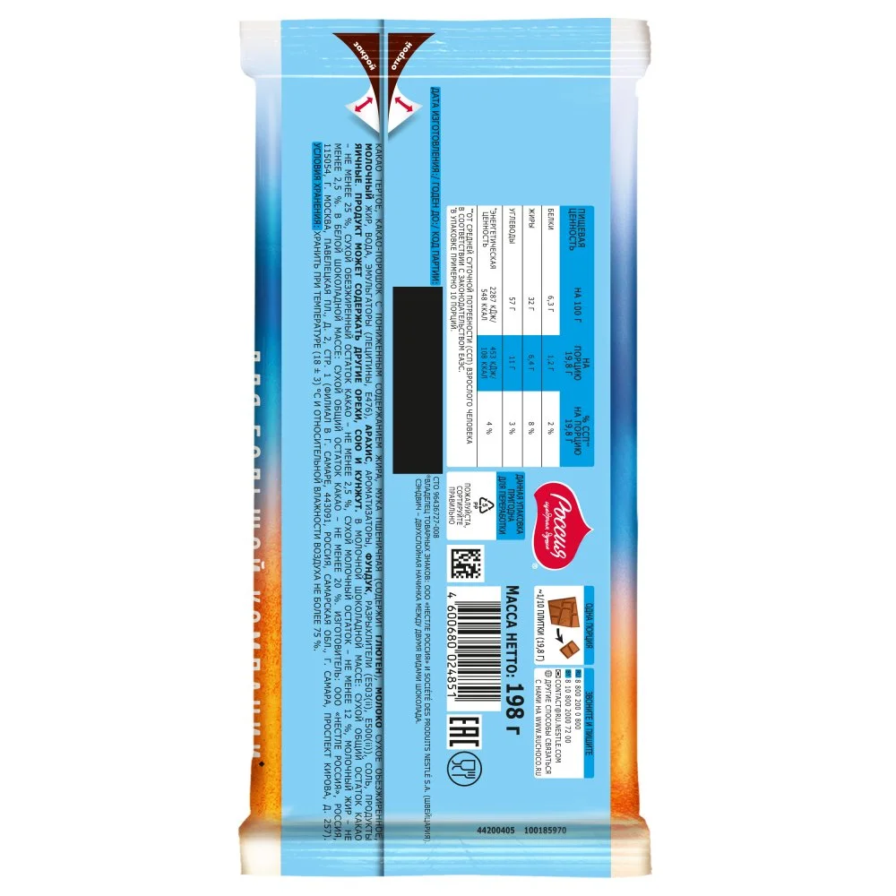 Сахар, жир специального назначения (из пальмового масла, молоко сухое цельное, масло какао, сыворотка молочная сухая, какао тертое, какао-порошок с пониженным содержанием жира, мука пшеничная (содержит глютен), молоко сухое обезжиренное, молочный жир, вода, эмульгаторы (лецитины, Е476), арахис, ароматизаторы, фундук, разрыхлители (Е503(ii), Е500(ii)), соль, продукты яичные. В молочной шоколадной массе: сухой общий остаток какао – не менее 25 %, сухой обезжиренный остаток какао – не менее 2,5 %, сухой молочный остаток – не менее 12 %, молочный жир – не менее 2,5 %. |