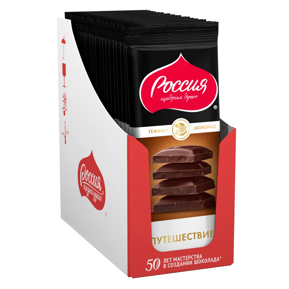 Храня верность традициям, мы создаём качественный шоколад по оригинальным рецептам. Шоколад Путешествие ® Темный шоколад от бренда "Россия"-щедрая душа!® - это классика темного шоколада с высоким содержанием какао-продуктов. Благородный терпкий вкус темного шоколада Путешествие с насыщенными нотками рома и притягательным вкусом какао - не оставят в стороне ценителей настоящего темного шоколада.
